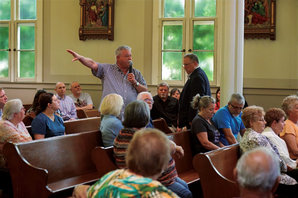 A packed community meeting at St. John the Baptist Catholic Church on Wednesday evening June 25th revealed deep divisions over parish renovation plans that would demolish the historic St. Francis Hall to make way for new construction.